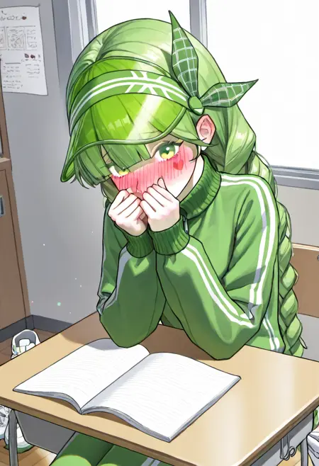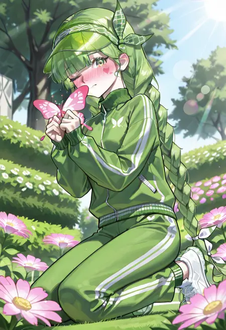 일반 프롬프트: 녹색 눈, 녹색 머리카락, 곧은 앞머리, 쌍둥이 땋은 머리