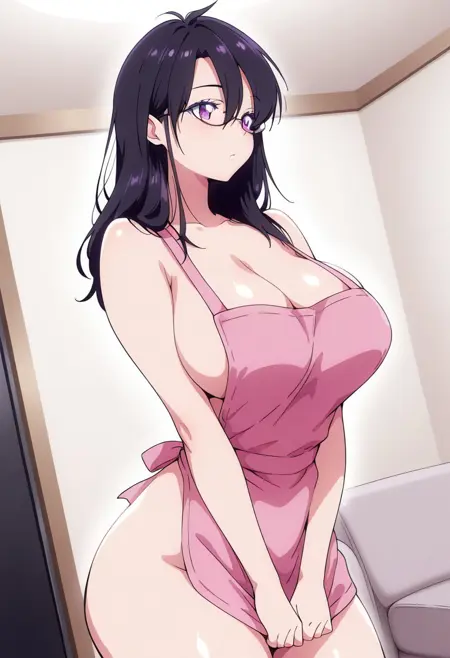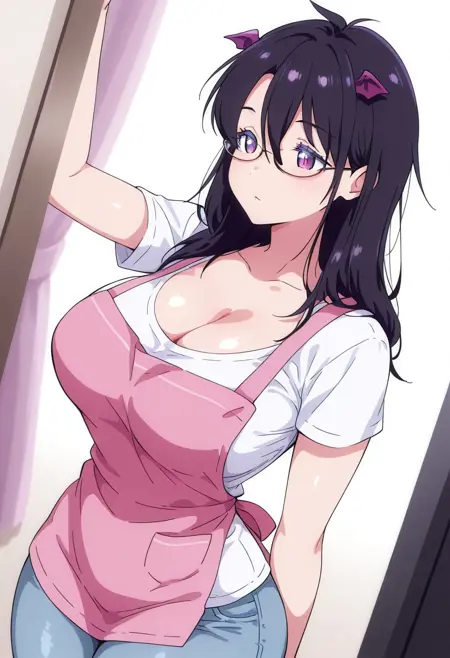 キャラクター エリ・モルティア: 1girl, eri, 紫の目, 黒髪, 長髪, 眼鏡, 胸, 大きな胸, 胸元