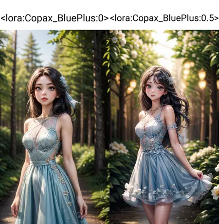Loraは画像の青い詳細を強化し、全体の色調を変更せずに青い要素を追加します(重みは低め~0.5)。たとえば、服を青みがかった色に変えたり、目を青い目に変換したりできます。花が存在する場合、それらも青く描かれる可能性が高くなります。