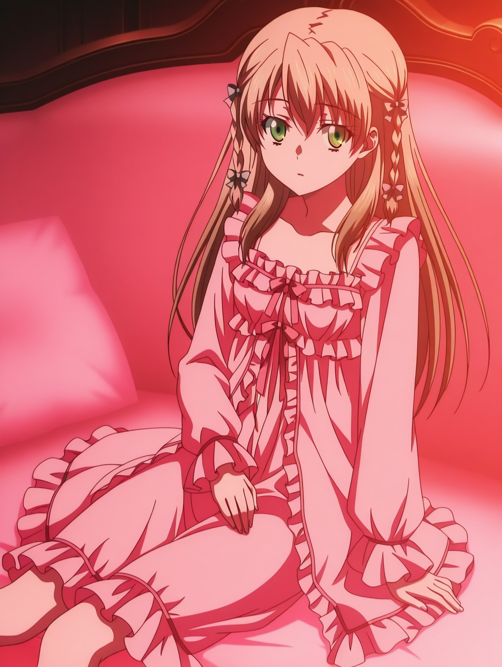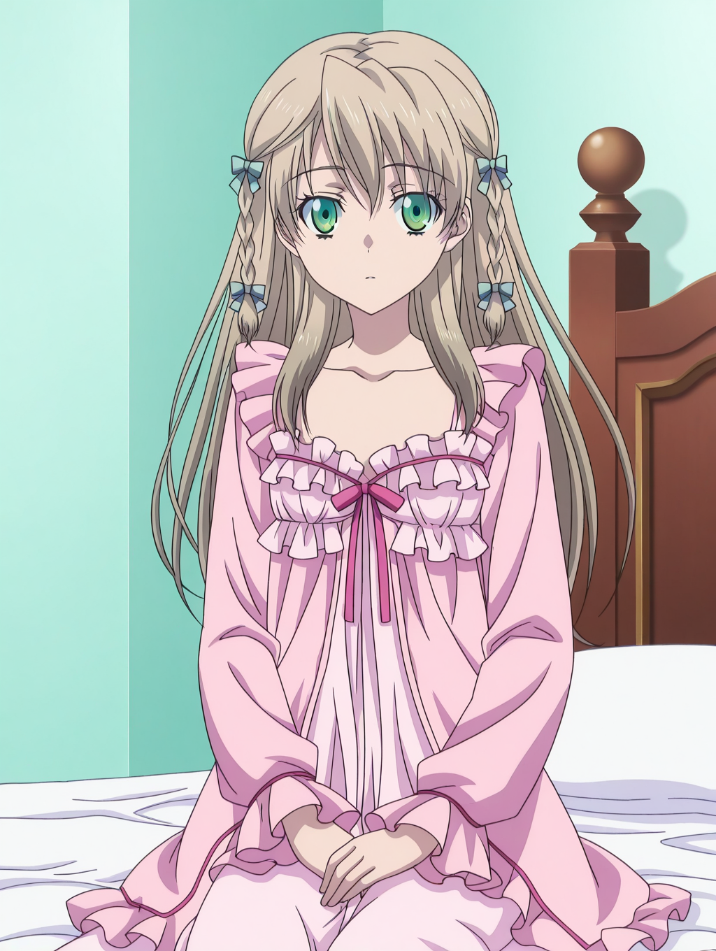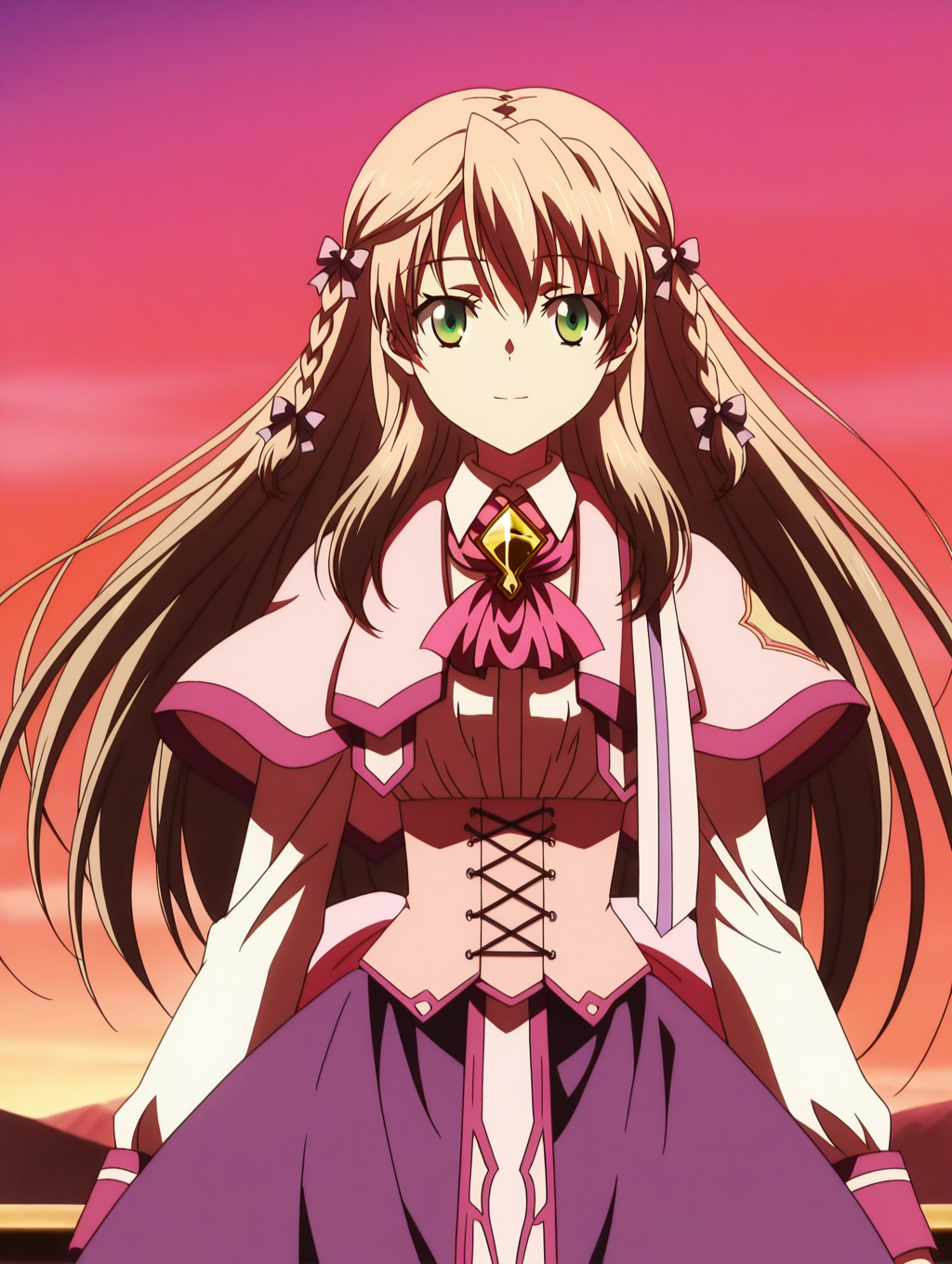 lora:Sion-ILXl-v1:1,long_hair,light_brown_hair,green_eyes,twin_braids,hair_ribbon,