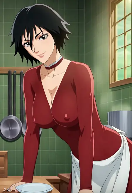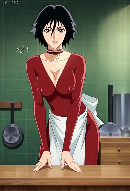 FroeseTRK, 1girl, solo, light-skinned woman, beautiful woman, black hair, short hair, black eyes, bright eyes, lips, cleavage, large breast, dark-red top, v-neck line, choker, hair between eyes, white apron, collarbone, shoes, red dress, long sleeves,