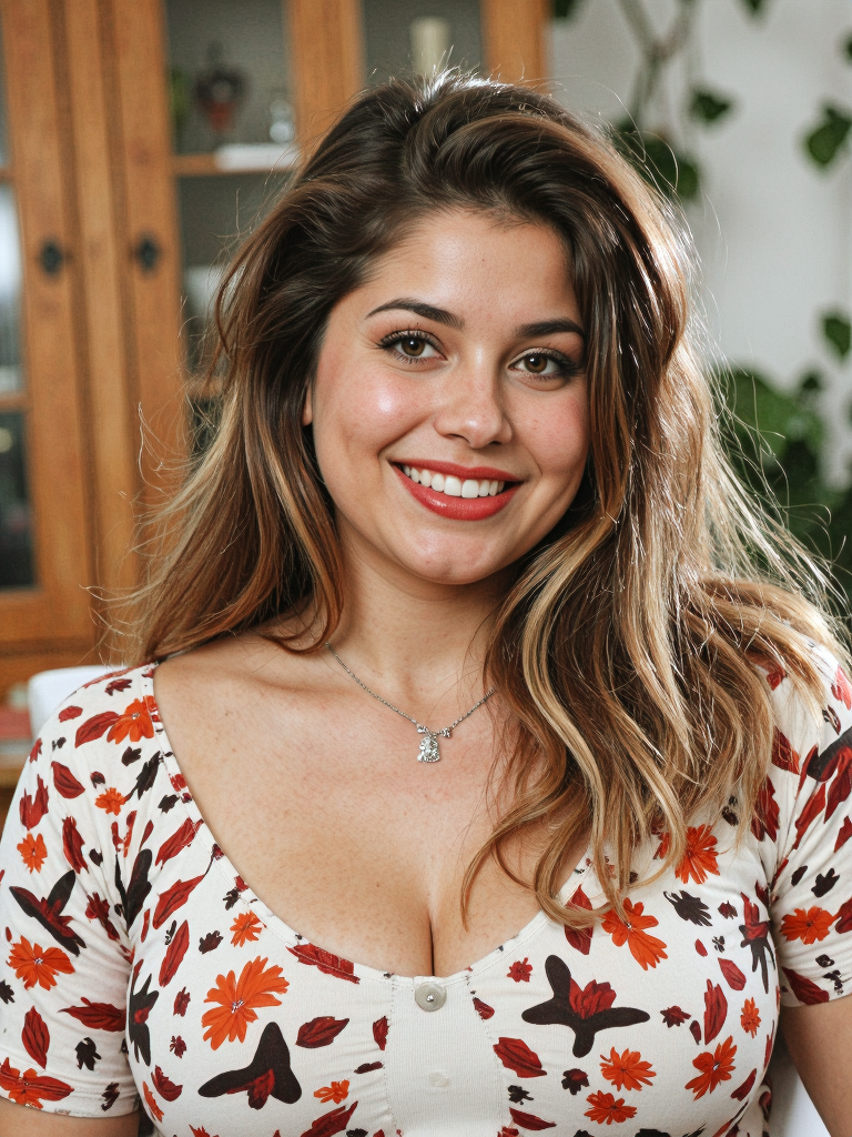 45歳の巨乳のジャマイカ女性が、熱帯植物とカラフルなアートで満ちた明るい自宅で、自信に満ちたポーズをとっています。彼女は体のラインを強調するフローリングの模様入りドレスを着ており、黒髪はふんわりとしたカールでスタイリングされています。窓から差し込む自然光が、彼女の温かく日焼けした肌と明るい笑顔を際立たせています。背景には個人的な思い出の品が並び、親密で居心地のよい雰囲気を演出しています。