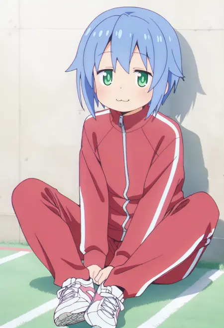 nemu-gym,fujimi nemu,green eyes,blue hair,short hair,d,:3,red track jacket,red track pants, sitting,sneaker