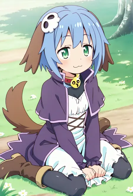 nemu-mmo,fujimi nemu,green eyes,blue hair,short hair,dog ears,brown ears,dog tail,brown tail,skull hair ornament,neck ornament,:3, purple capelet, purple coat,black shirt, white dress,black pantyhose,boots