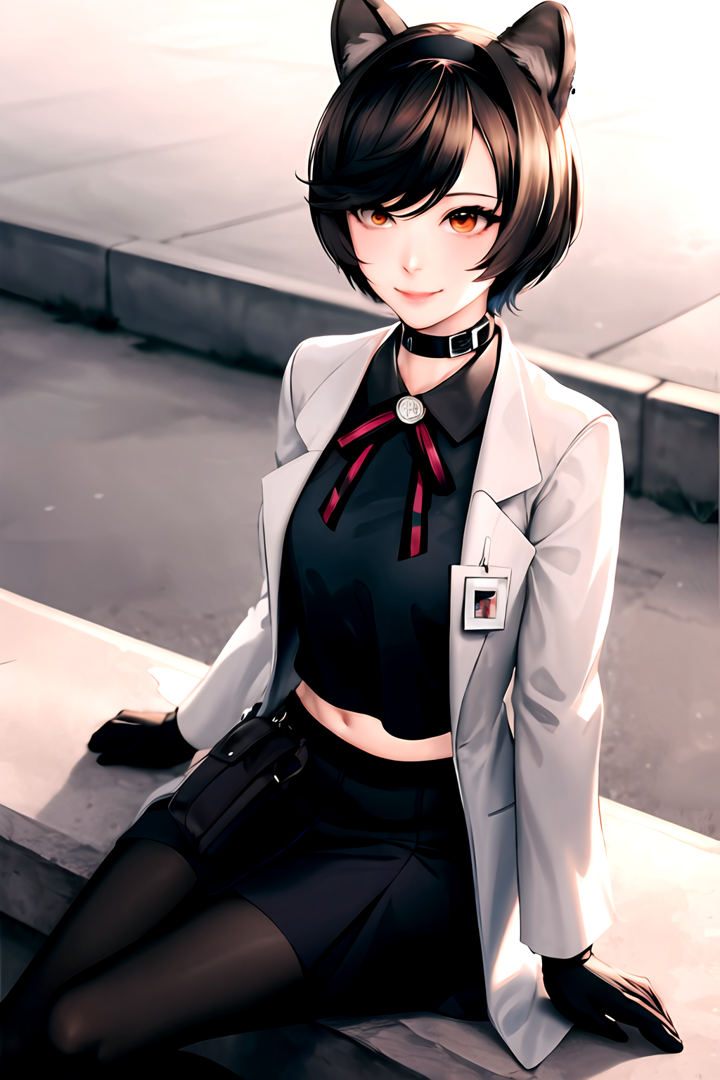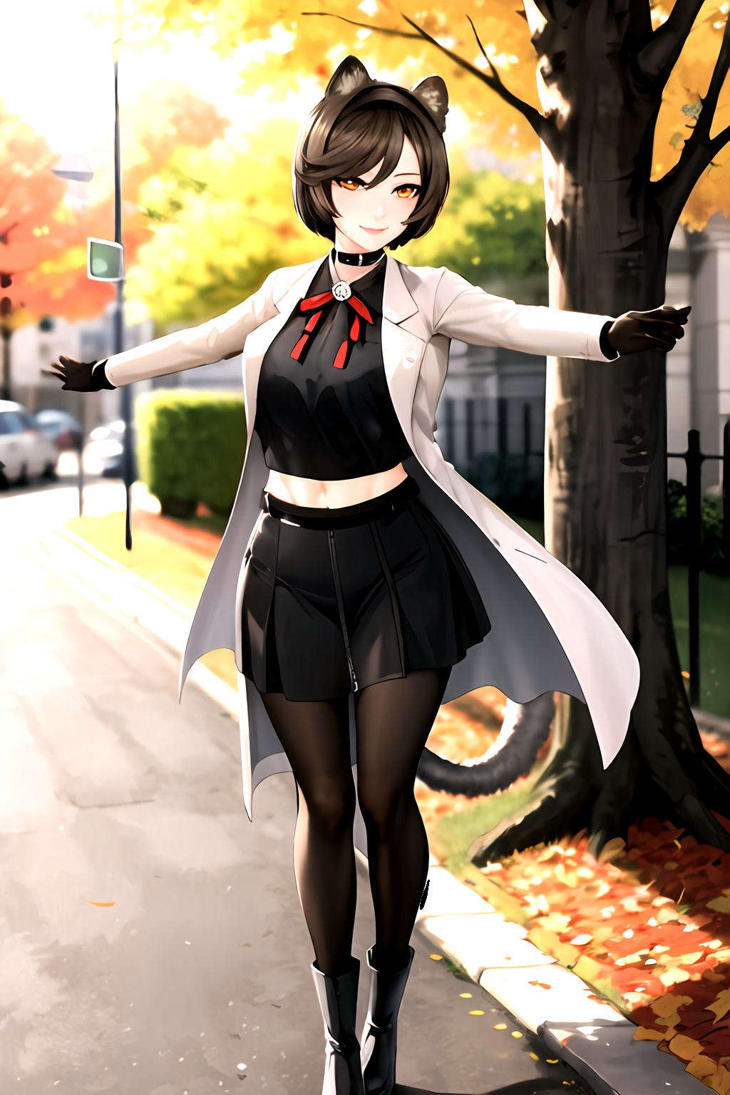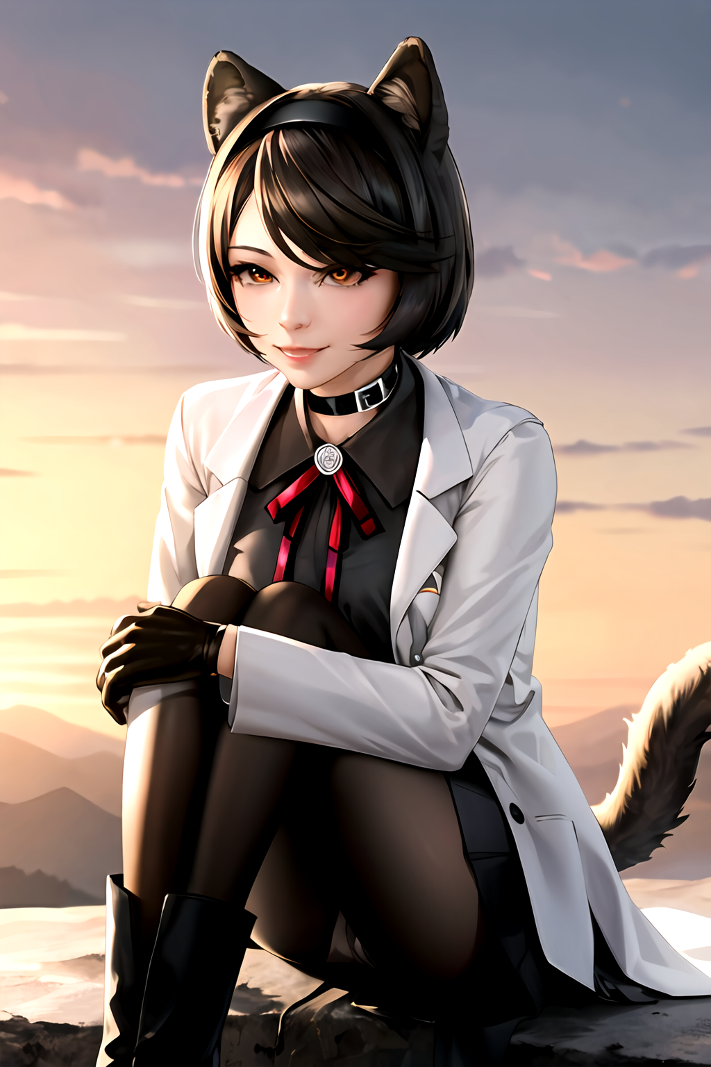short hair, skirt, brown hair, shirt, gloves, long sleeves, ribbon, animal ears, brown eyes, tail, pantyhose, hairband, boots, choker, black gloves, collared shirt, black skirt, red ribbon, coat, orange eyes, black shirt, neck ribbon, swept bangs, black choker, labcoat, midriff peek,