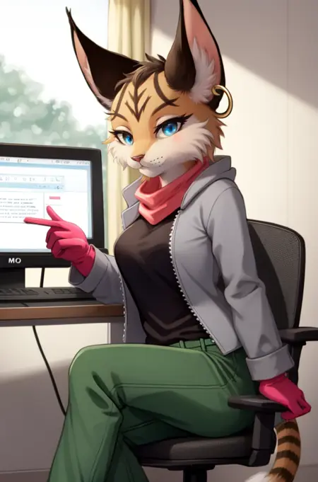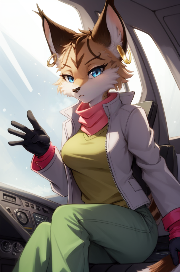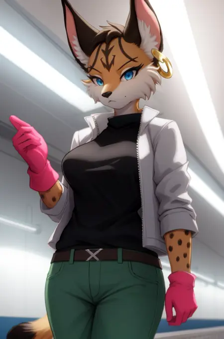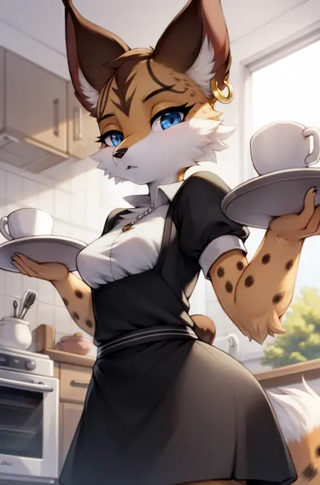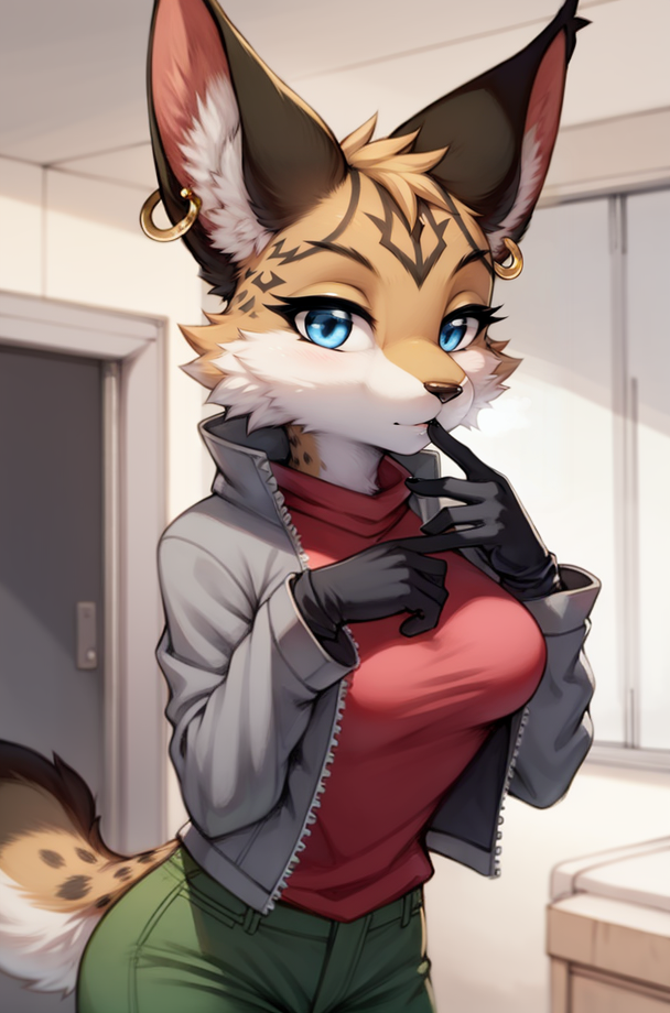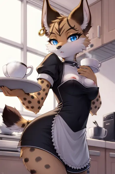 (brown fluffy fur, lynx ears, blue eyes, small breasts, gold hoop ear ring)