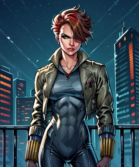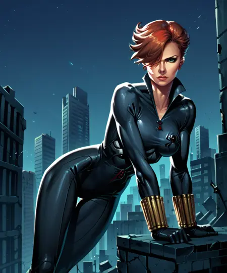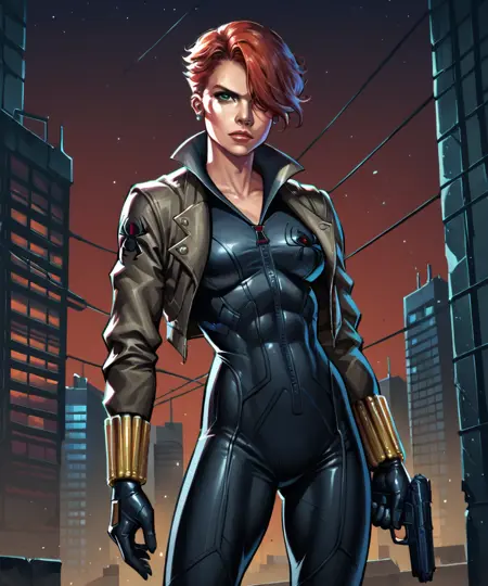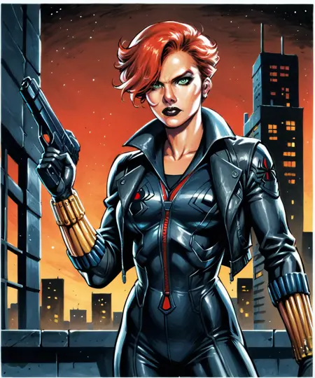 예시: Sore_9, score_8_up, score_7_up, 트래디셔널 아트 커버, 만화, 영문 텍스트, blackwidow80s++, widowBodysuit, 라텍스 바디수트, widowbracelet, jacket++, 권총 들고 있음, spiderlogo, 피키 헤어컷, 1girl, solo, 녹색 눈, 빨간 머리, 짧은 머리, 어두운 립스틱, 한쪽 눈 위의 머리카락, 시선을 바라봄, 시티 스케이프+, 고층 빌딩, Marvel comic style++