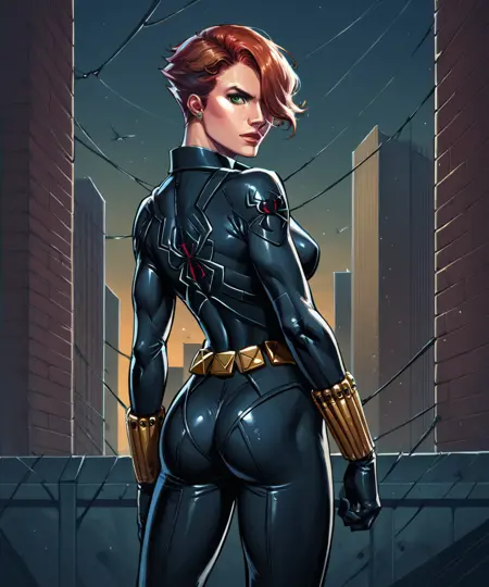 예2: Sore_9, score_8_up, score_7_up, 엉덩이 촬영, 뒤에서 본 blackwidow80s++, widowBodysuit, 라텍스 바디수트, spiderlogo, 피키 헤어컷, 1girl, solo, 녹색 눈, 갈색 머리, 짧은 머리, 한쪽 눈 위의 머리카락, 시선을 바라봄, 시티 스케이프+, 고층 빌딩, 공중기동 스턴트, Marvel comic style,