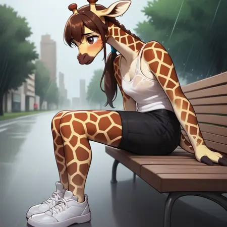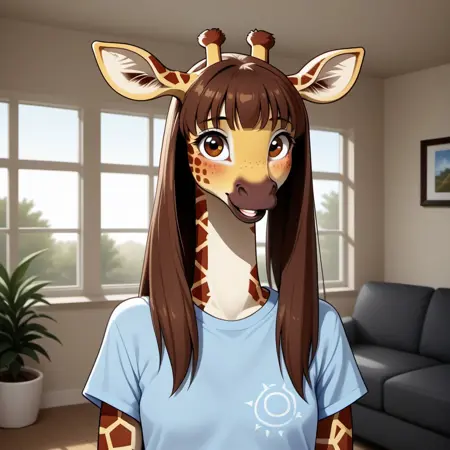 Creates an anthro giraffe girl. Brown hair, brown eyes, longer neck than the average anthro female.