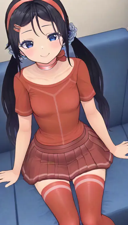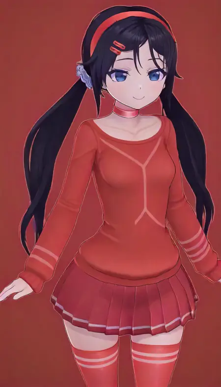 1girl,solo,black_hair,red_shirt, blue_skirt,red_socks,long_hair, red_thighhighs,blue_eyes,hair_ornament,red_choker,smile,hairclip,pleated_skirt,twintails,hairband,hair_scrunchie,sweater,collarbone,miniskirt