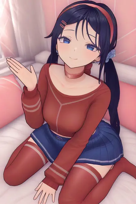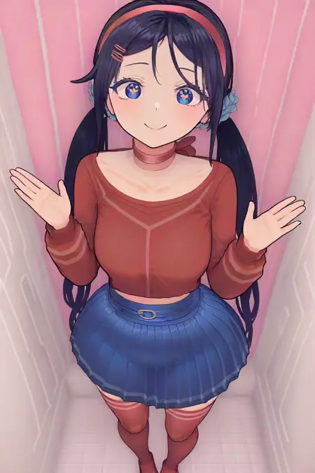 1girl,solo,black_hair,red_shirt, blue_skirt,red_socks,long_hair, red_thighhighs,blue_eyes,hair_ornament,red_choker,smile,hairclip,pleated_skirt,twintails,hairband,hair_scrunchie,sweater,collarbone,miniskirt