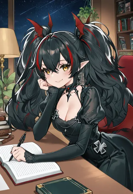 | 训练词汇 | zZ24, hair between eyes, yellow eyes, black hair, hair ornament, long hair, multicolored hair, pointy ears, red hair, streaked hair, twintails, two-tone hair, wing hair ornament,已复制! zZ24, hair between eyes, yellow eyes, black hair, hair ornament, long hair, multicolored hair, pointy ears, red hair, streaked hair, twintails, two-tone hair, wing hair ornament, cross, cleavage, black choker, iron cross, choker, dress, wings, black dress,已复制! |