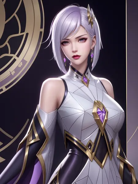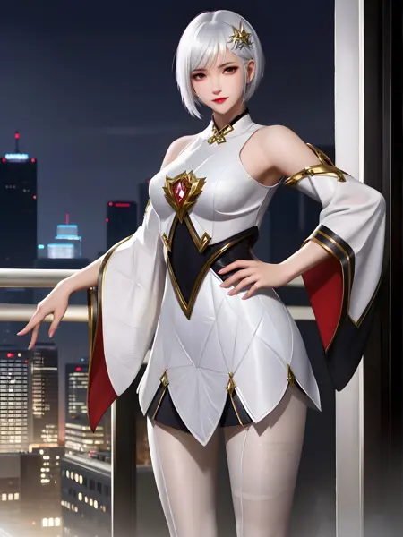 - WZRYjingYP, 1girl, solo, fingerless gloves, jewelry, earrings, standing, looking at viewer, white hair, bare shoulders, short hair, gem, elbow gloves, black gloves, bangs, makeup, detached sleeves, night, mature female, cityscape, shiny clothes, poolside, hand on hip,