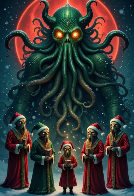 H.P. 러브크래프트의 크툴루 신화는 우주적 공포 팬들에게 오랫동안 매력을 끼쳤으며, 이해 불가능한 존재, 고대 종교, 불가능한 기하학이 가득한 세계를 제공합니다. 크툴루 크리스마스 LoRA는 이 어두운 신화를 즐겁고 혼란스러운 크리스마스와 대비시켜 주제의 재미있는 충돌을 만들어냅니다. 산타 크툴루가 이해할 수 없는 선물을 배달하거나, 엘드리치 성가대가 광기의 눈폭풍을 소환하는 초현실적 유머를 상상해보세요.