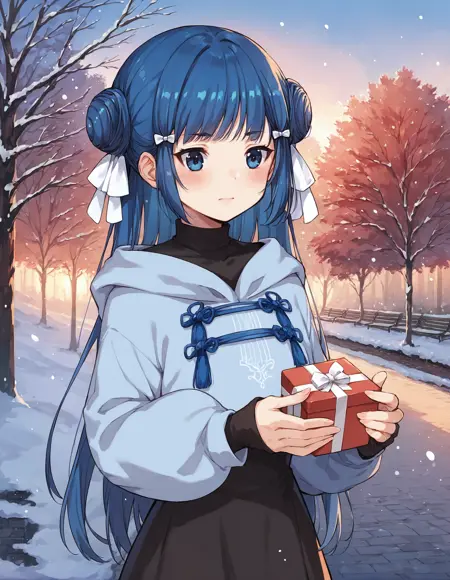 冬の衣装: mgrcchunmeiyui、長い髪、白い髪止め、黒いタートルネックドレス、青いオフショルダー短めのフーディー、黒いタイツ