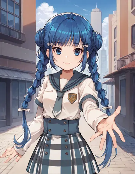 カジュアルな衣装: mgrcchunmeiyui、ツインブレイド、白い髪飾り、白いシャツ、青いセーラー襟、青いネクタイ、短い上着に長い袖、青いチェック柄スカート、白いももひき