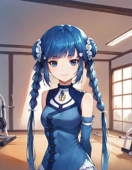 魔法の衣装: mgrcchunmeiyui、ツインブレイド、白いヘアリング、髪のリボン、白い髪飾り、青い胸の宝石、青いノースリーブ中国風ドレス、取り外し可能な広い青い袖、白いフリル、青いフィンガーレスグローブ