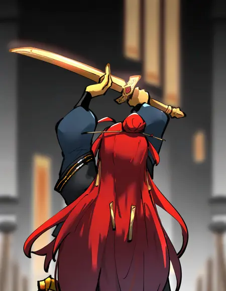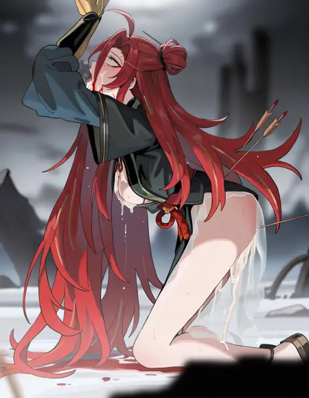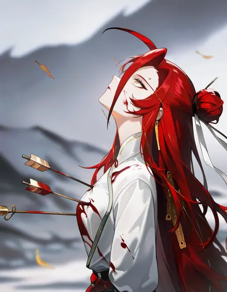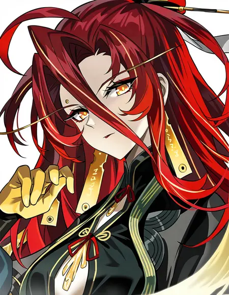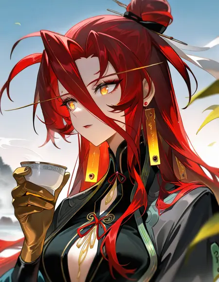 xytx-chuyi,1girl,solo,red hair,long hair,very long hair,earrings,yellow eyes,hair between eyes,hair ornament,tassel,jewelry,gloves,chinese clothes,dress,
