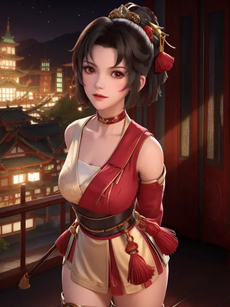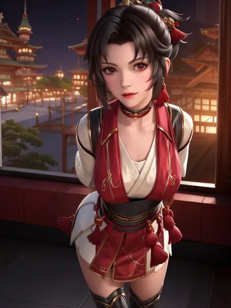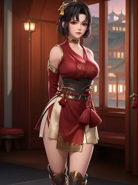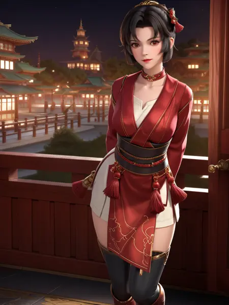 - WZRYyunyingYP,1girl,solo,brown hair,brown eyes,choker,black gloves,boots,looking at viewer,hair ornament,breasts,single glove,dress,obi,sash,cityscape,night,standing,