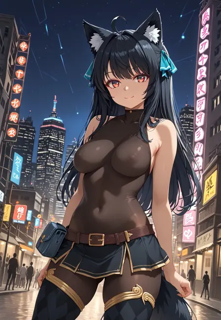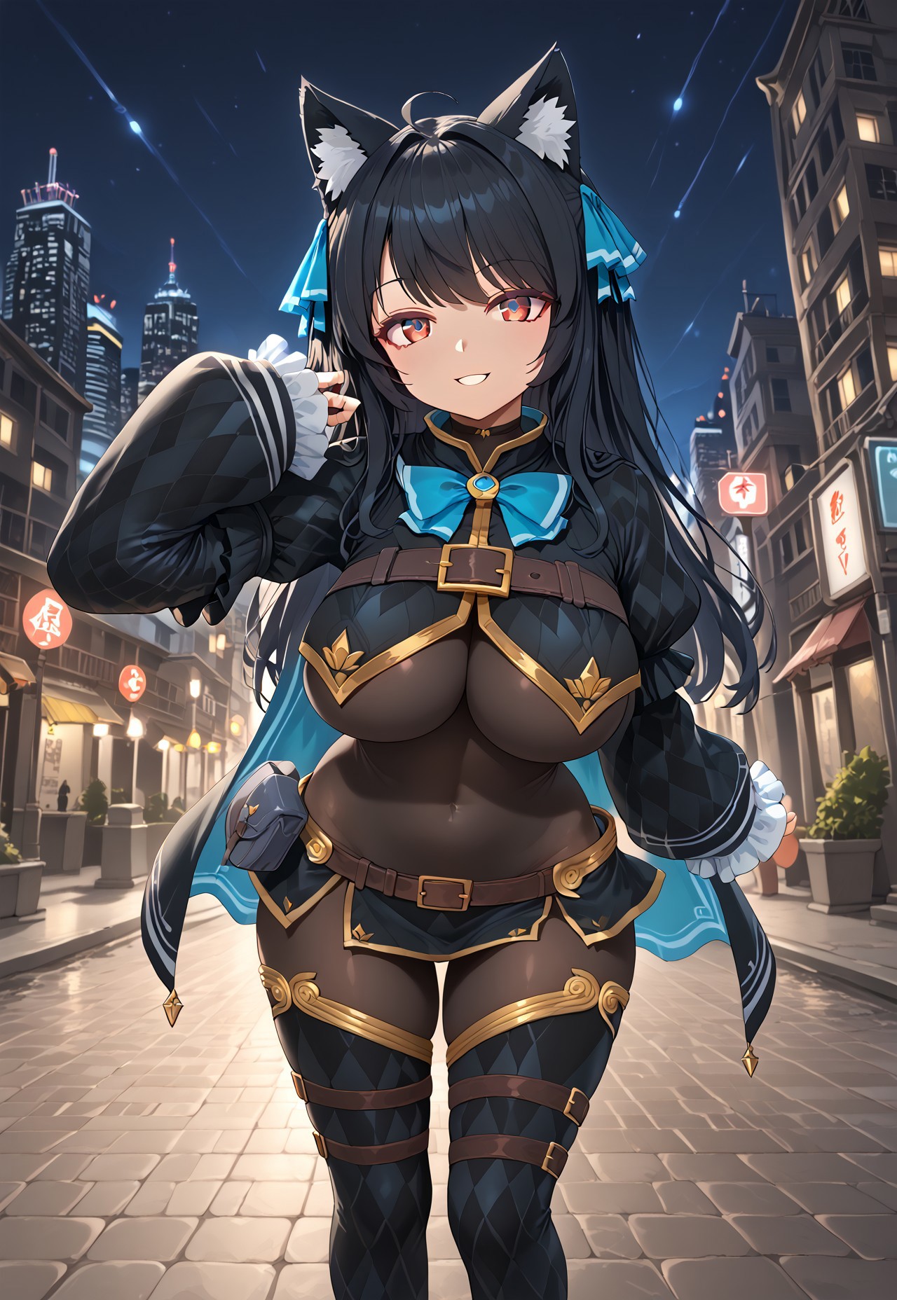 SvartLilja,狐狸耳朵,黑发,长发,长袖,动物耳朵绒毛,刘海,蓝色丝带,狐狸尾巴,遮盖肚脐,全身紧身衣,红眼,格子图案鞋履,腰带包,蓬松袖子,蓝色蝴蝶结,大腿袜,荷叶边袖子,袖子超过手腕,短款夹克,朱丽叶袖,斗篷,小披肩,胸带,