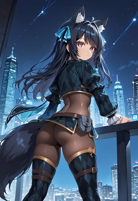 SvartLilja, fox ears, black hair, long hair, long sleeves, animal ear fluff, bangs, blue ribbon, fox tail, covered navel, bodystocking, red eyes, argyle footwear, belt pouch, puffy sleeves, blue bow, thighhighs, frilled sleeves, sleeves past wrists, cropped jacket, juliet sleeves, cape, capelet, chest belt,