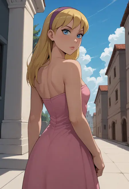 main tags: 1girl, solo, blue eyes, blonde hair, long hair, breasts, small breasts, hairband, purple hairband, dress, pink dress, strapless dress, strapless, bare shoulders,
