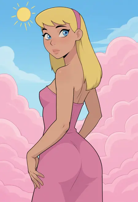 주요 태그: 1girl, solo, 파란 눈, 금발, 긴 머리, 가슴, 작은 가슴, 머리띠, 보라색 머리띠, 드레스, 분홍색 드레스, 어깨 노출 드레스, 어깨 노출, 어깨 드러냄,