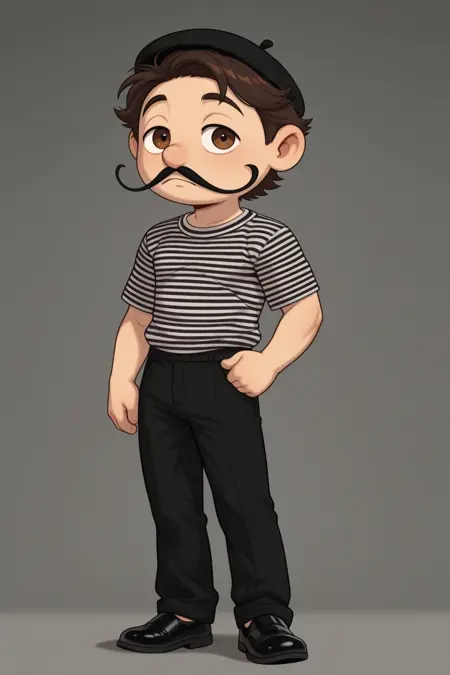 JacquesPierreFrancoisSML, 1boy, short brown hair, white and black striped shirt, short sleeves, black french hat, brown eyes, black shoes, black pants, long black mustache,