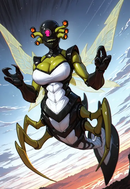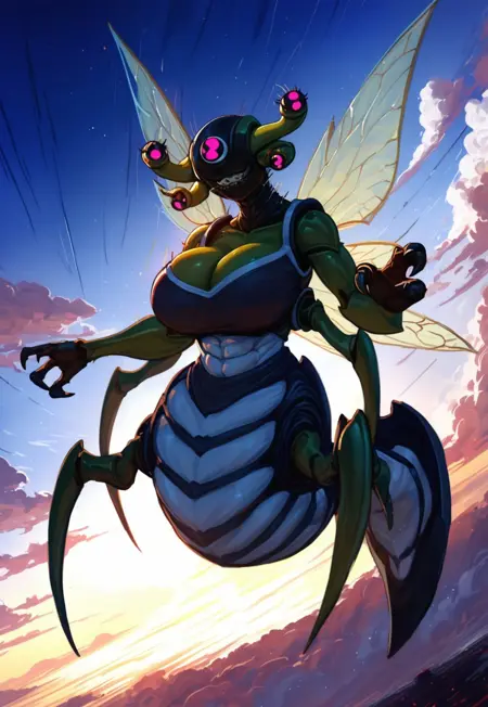 | トレーニングワード | arthropod abdomen, six-pack abs, noseless, big breasts, alien girl, extra eyes, no pupils, 4eyes, four antennae, green skin, two-toned skin, dark face, black and white clothes, crooked teeth, arthropod girl, black hands, claws, fewer digits, 3 fingers, insect green wings, wings, stinger on tail, tail, insect legs, 4 legsコピーしました! (Insectoid version)コピーしました! |