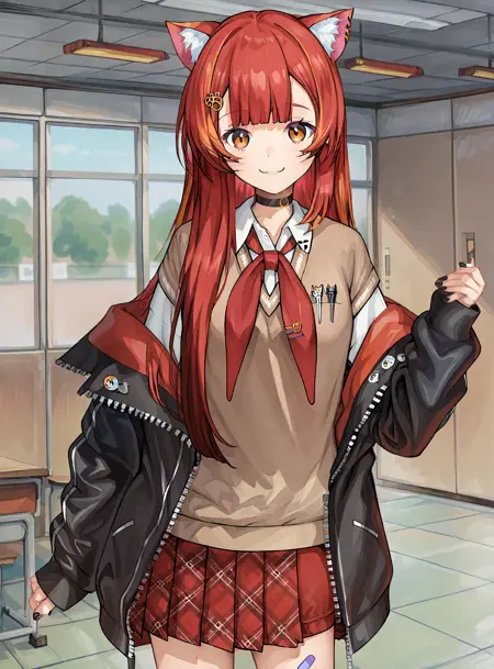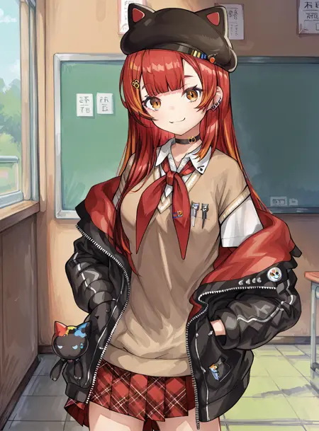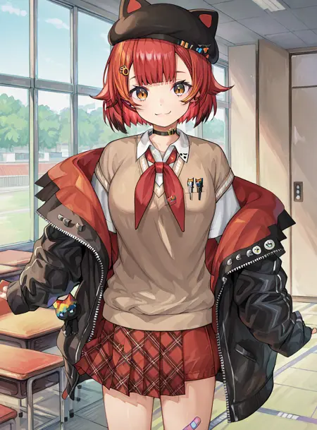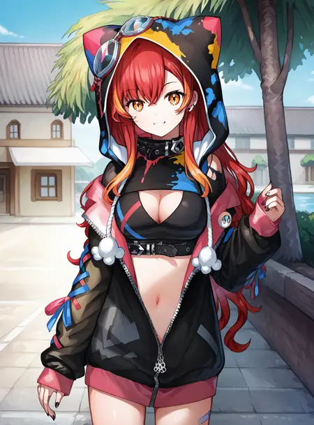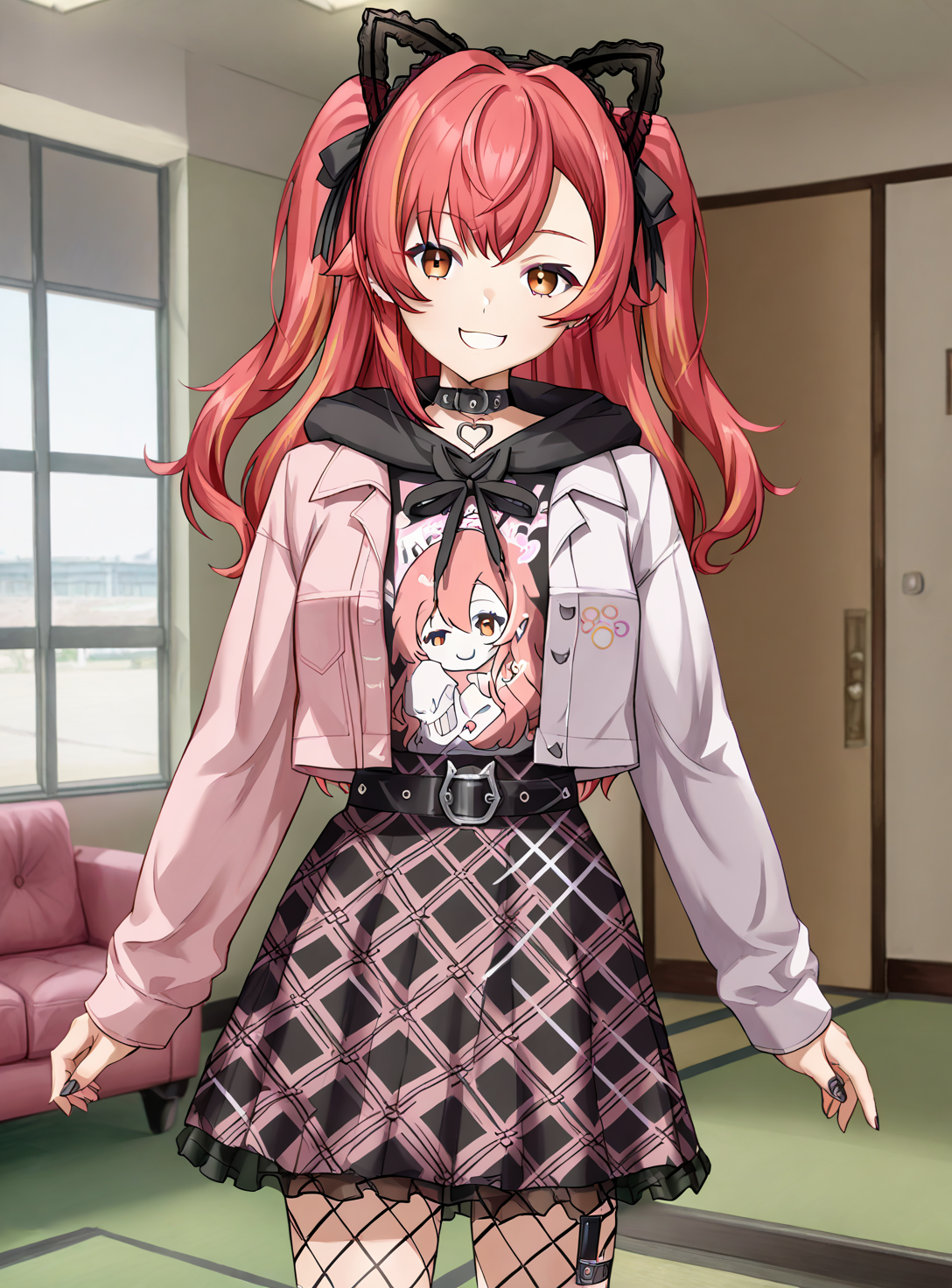 "TsunaJirai, two side up, black hoodie, plaid skirt, character print,"