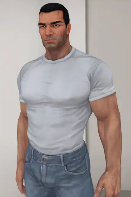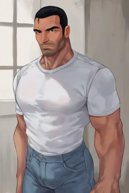 frankcastle, 1boy, solo, male focus, mature male, short hair, black hair, hair slicked back, brown eyes, thick eyebrows, facial hair, stubble,