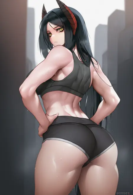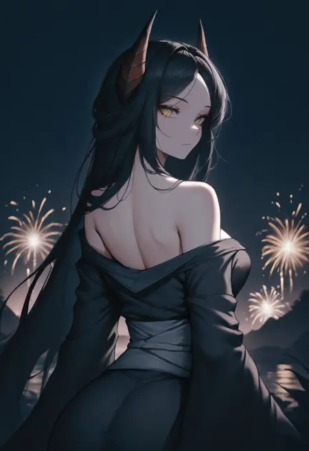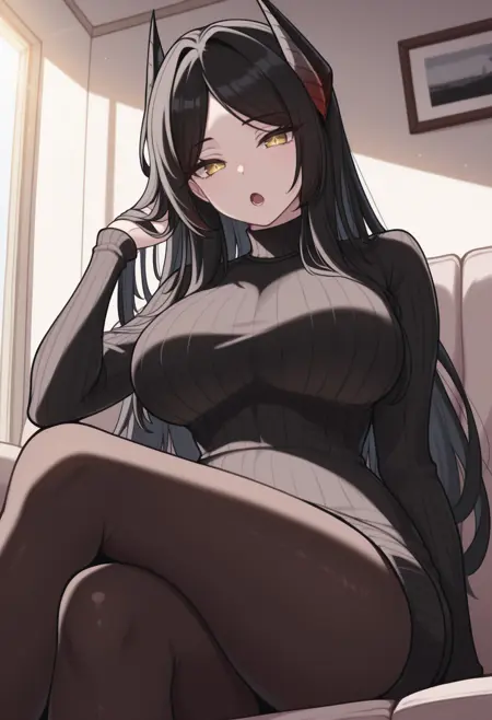 기본 옷차림: in3sdef, 긴 머리, 검은 머리, 갈라진 앞머리, 악마의 뿔, 노란 눈, 십자가 모양의 동공, 검은 재킷, 단정한 재킷, 검은 스웨터, 터틀넥 스웨터, 짧은 드레스, 검은 드레스, 긴 소매, 검은 소매, 분리된 소매, 검은 벨트, 벨트 주머니, 허벅지 스트랩, 검은 신발, 무릎 부츠, 하이힐 부츠, 어깨 노출, 큰 가슴
