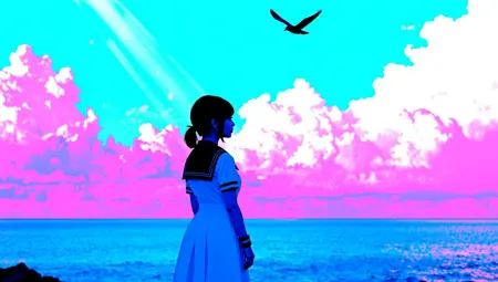 Neon style, studio award-winning photography; ... ... A young woman with very long, straight purple hair and bright yellow eyes stands solo, looking at the viewer. She wears a sleeveless grey sundress adorned with a blue ribbon and a large bow at the collarbone. On her head, she has a straw sun hat decorated with a purple bow and a yellow flower. In her hands, she holds a bouquet of sunflowers, adding a cheerful touch to her outfit --style raw --sref 3470341003 --v 6.1
