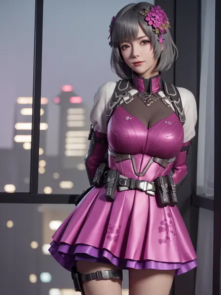 - mature female, belt, arms behind back, cityscape, night, facial mark, close-up, indoors, window, 1girl, blush, skirt, thigh holster, tight strap, looking at viewer, standing, holster, hair ornament, hair flower, dress