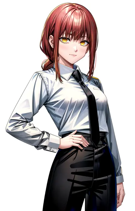 For her standard clothes, put in something like: (office clothes, white shirt, black necktie, black pants:1.15)
