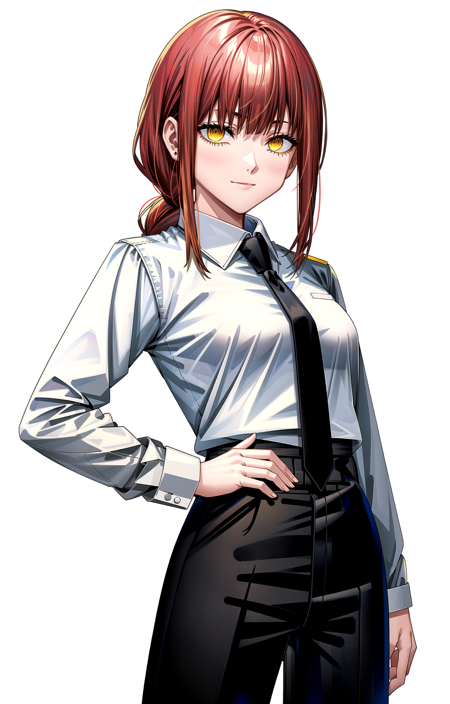그녀의 일반적인 옷차림에는 다음과 같이 입력하세요: (오피스 복장, 흰 셔츠, 검은 넥타이, 검은 바지:1.15)