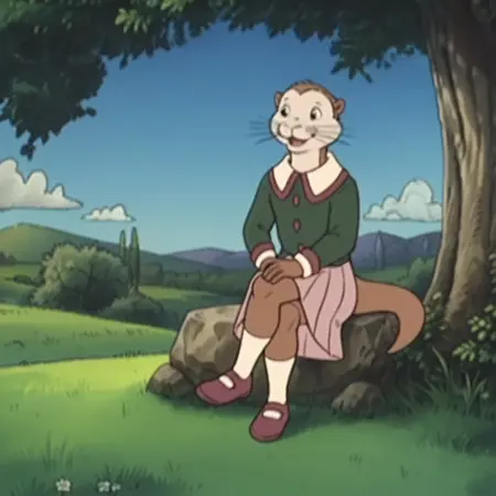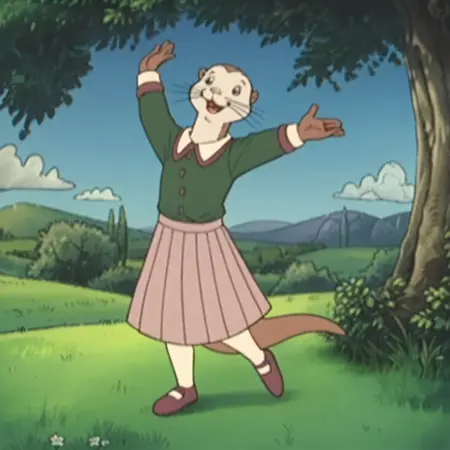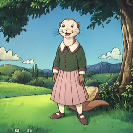 OttolineOtter, anthro, female, otter, brown fur, green shirt, long sleeves, pink skirt, white socks, brown shoes