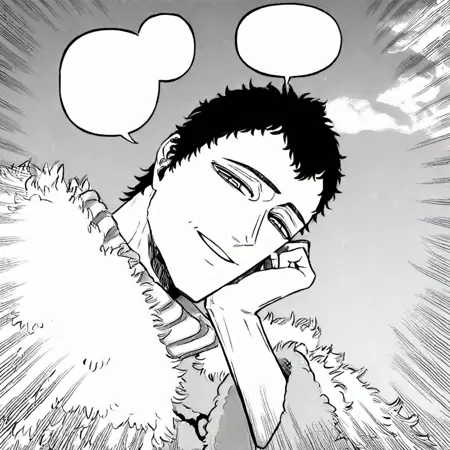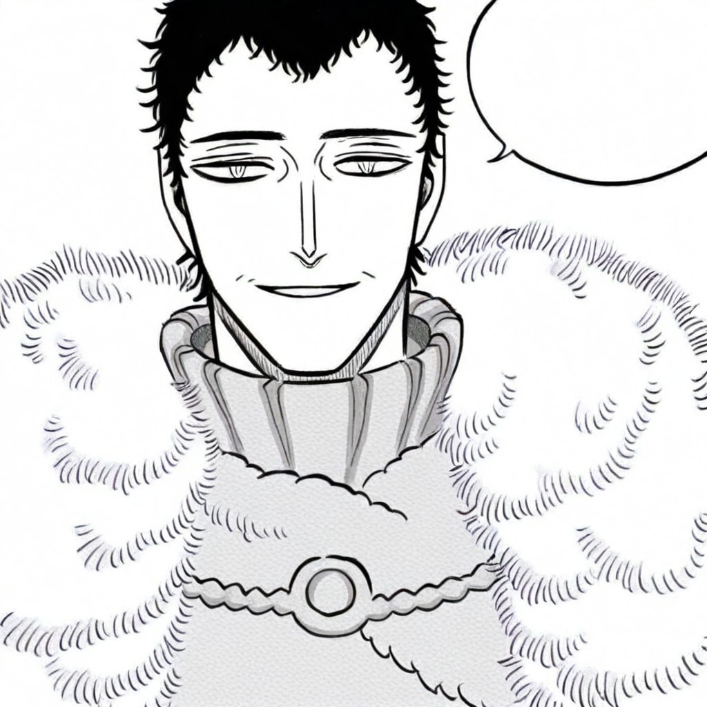 Outfit 1: lucius(humanform), short hair, black hair, sun mark on forehead, fur robe, detailed knit texture, dark chest straps,fur trim, turtleneck, fur mantle, fur cape, manga style