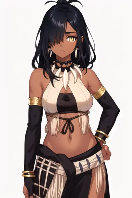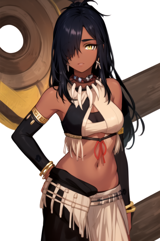 | 训练词汇 | ShamalaMabinogi, 1girl, solo, long hair, black hair, elbow gloves, navel, bare shoulders, jewelry, medium breasts, yellow eyes, earrings, detached sleeves, midriff, dark skin, necklace, hair over one eye, bracelet, dark-skinned female, tribal, tooth necklace已复制! |