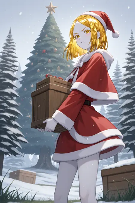 의상 1: 검은 셔츠, 불룩한 짧은 소매, 흰색 칼라 셔츠, 검은 넥타이, 팔꿈치 장갑, 회색 장갑, 검은 반바지, 흰색 벨트, 회색 허벅지 양말, 검은 신발