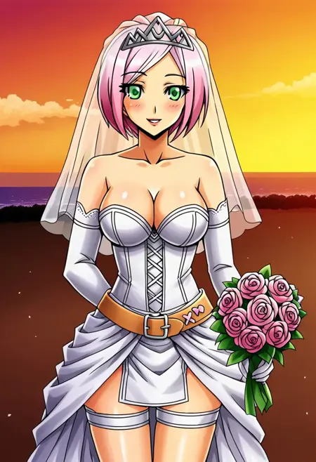 wedding_attire, tiara, bridal veil, wedding dress, downblouse, white elbow gloves, flower belt, thigh strap