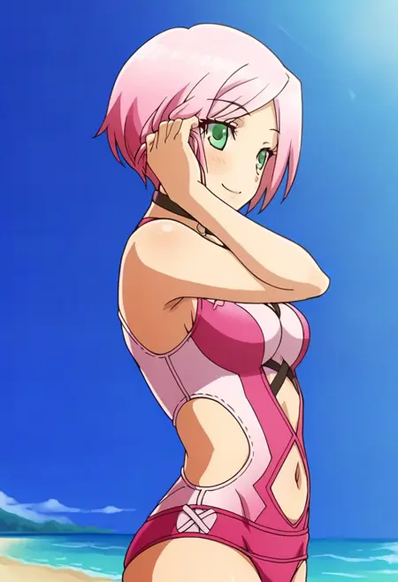 swimsuit_attire, choker, pink one-piece swimsuit, navel cutout