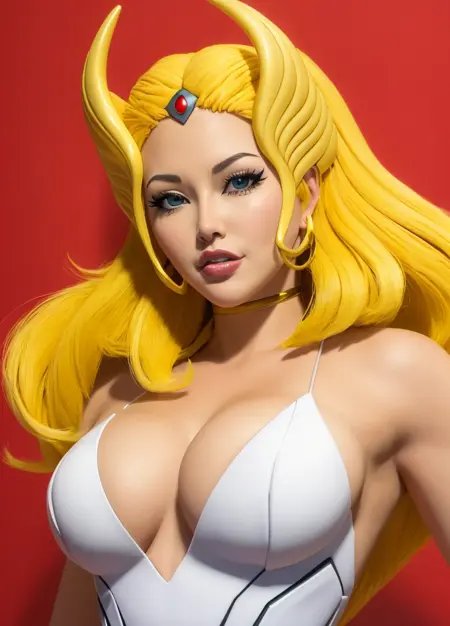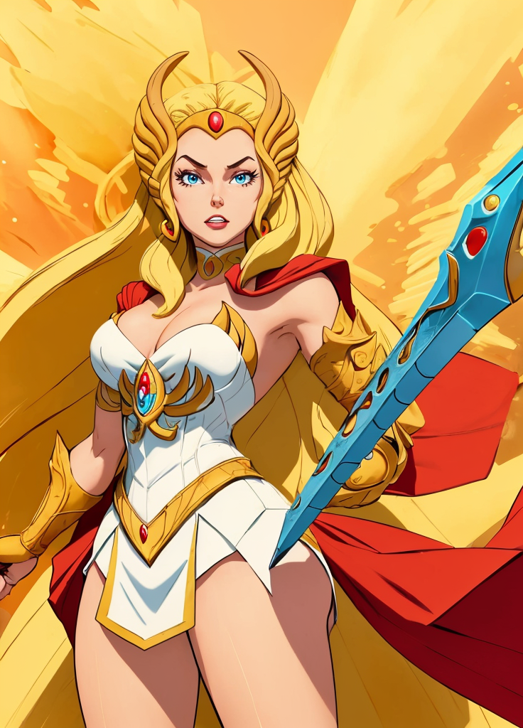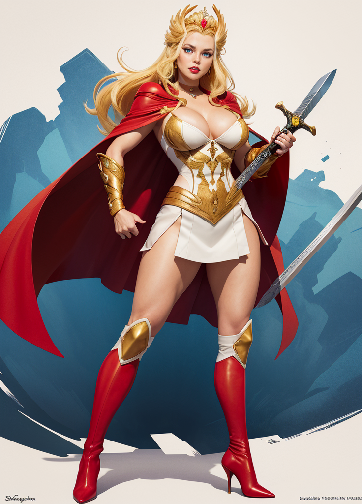 cartoon,(best quality:1.17), (masterpiece:1.17), (detailed:1.15), by Rob Liefeld, style of Neal Adams, blond hair, 1girl, solo, long hair, breasts, blue eyes, blonde hair, dress, cleavage, jewelry, medium breasts, full body, weapon, boots, choker, long sword, cape, white dress, high heels, cosplay, makeup, knee boots, tiara, lipstick, black background, high heel boots, gold tiara, cartoon, SheRaQuiron, holding sword, red cape, superhero, yellow footwear, SheRaQuiron character, 1girl, bue eyes, rampage, lora:quiron_SheRa_V2_lora:0.77