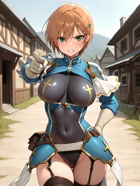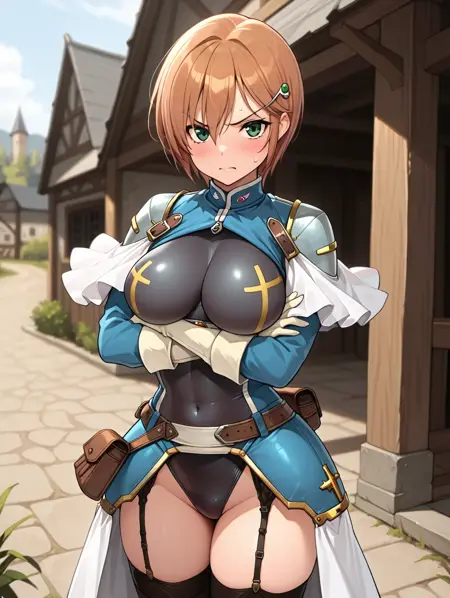 ソニア、茶髪、短髪、緑の目、大きな胸、髪飾り、黒いレオタード、黒いタイツ、ガーターストラップ、青いジャケット、青い鎧、白い肩当て、白いフリル、肌にフィットする、手袋