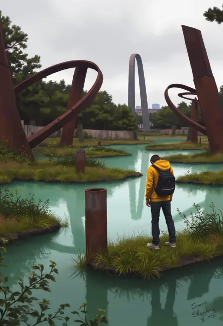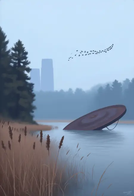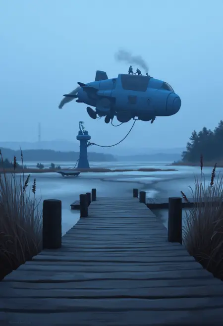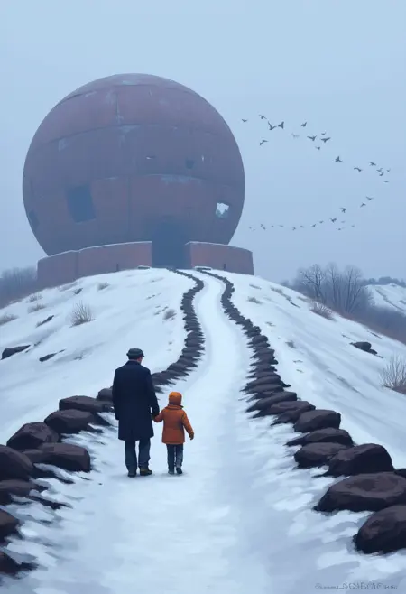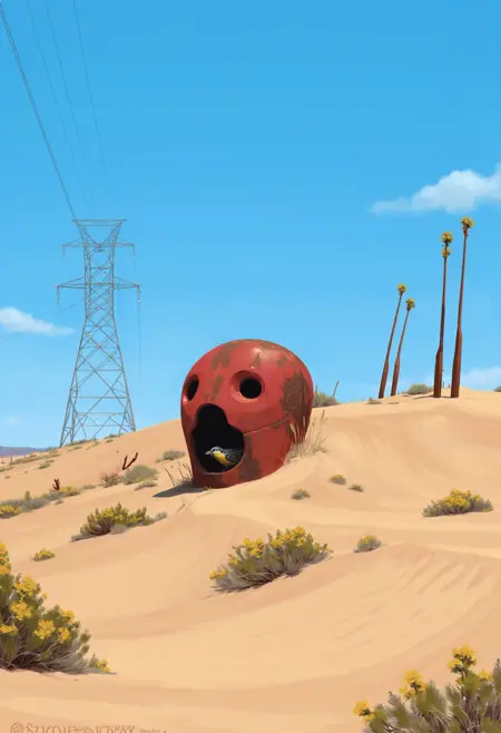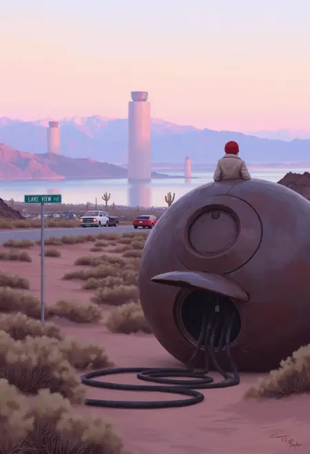 - これは、不思議なポストアポカリプスの風景を描いたデジタル絵画です。前景には、円形のハッチパネルが開き、下部から多数のケーブルが伸びた巨大な球状の金属物体が、砂漠のような環境に置かれています。この物体は風雨にさらされており、粗い質感を持っています。上部のハッチから半分だけ体をのぞかせた少年が、カメラから離れて遠くを見つめています。彼は薄い色のジャケットと赤いニット帽を着ています。左側には、青い道路標識に「LAKE VIEW rd.」と書かれています。背景には広大な乾燥した風景が広がり、遠くに山脈と、おそらく人工湖である大きな静かな水辺が見え、夕陽の柔らかなパステル色を反射し、場面全体に温かな光を投げかけています。