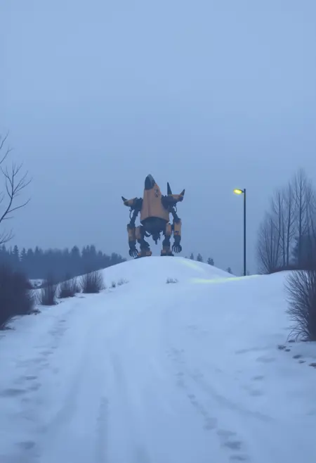 背景は薄い青空で、雪に覆われた地面と滑らかに溶け合っています。丘の周囲には葉のないスパースな木々や低木が点在し、枝は曇った空にむき出しになっています。ロボットの右側には、単独の街灯が立ち、冷たい青い大気に対して暖かい黄色い光を放っています。この光の存在は、周囲の暗闇と明確に対比し、場面に温かみを加えています。