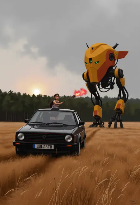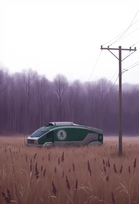 - これは、田園地帯の霧のかかった曇り空の朝の情景を描いたデジタル插画です。画像には、3台の巨大な未来型車両がフィールドに駐車されており、その滑らかな金属質の表面が周囲の光を反射しています。車両は画像の左側に配置されており、1台は背の高い草に部分的に隠され、もう1台は手前にあります。小さな黄色い塗装のロボットが、大きな車両の一つの上に座っており、小さな青緑色の光る目をひとつ持っています。