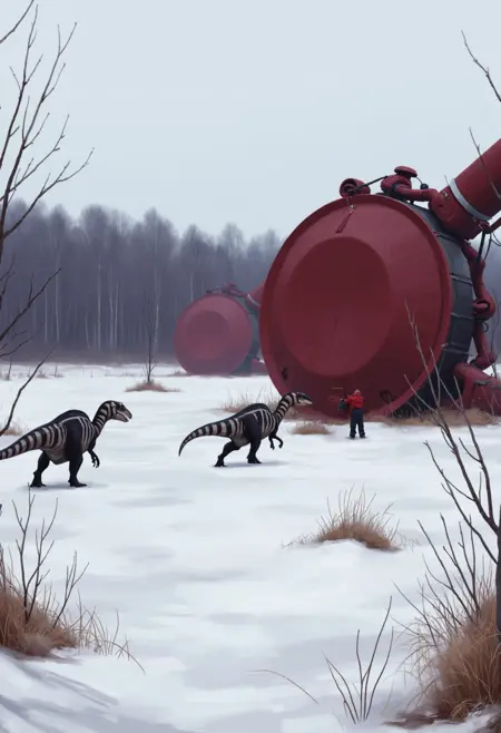 雪の質感は滑らかで反射的であり、ロボットの重さと街灯の光によるわずかな影が示されています。絵画全体の雰囲気は沈鬱で思索的であり、未来主義的要素と自然的要素が調和しています。