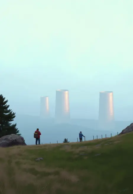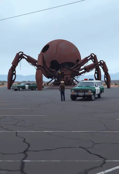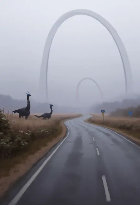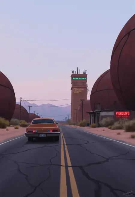 中景には、海岸沿いに並ぶ複数の高さのある円筒構造物があり、その上部は消えゆく光に照らされています。赤い車と白いトラックなど複数の車両が道路を走行しており、塔のふもとに小さな町へと続く道を示しています。植生は少なく、乾いた茶色の低木やサボテンが点在しています。全体の色調は、落ち着いた土色と柔らかなパステルカラーで支配され、夢のような空気を生み出しています。このイメージは、現実とファンタジーの要素を融合させ、砂漠の厳しく孤絶した美しさと巨大な金属物体の不気味な存在感に焦点を当てています。