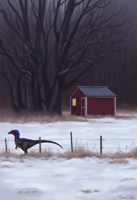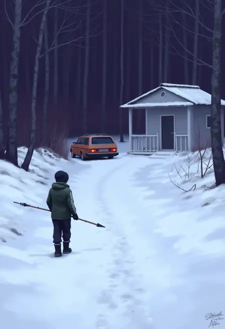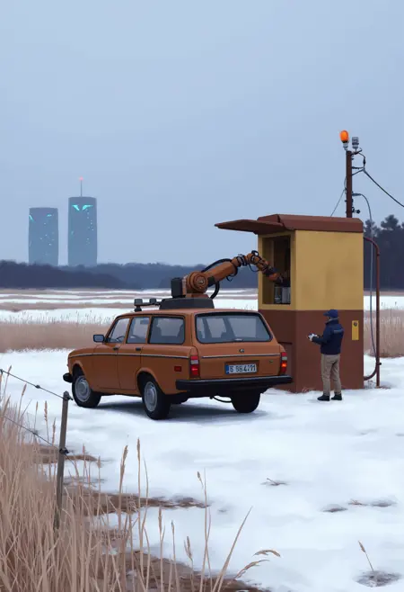 - これは、静かな冬の情景を描いたデジタル絵画です。中心には、雪に覆われた地面の上に支柱で支えられた小さな素朴な小屋があり、赤い縦型の木製外壁を持っています。小屋の左側には小さな四角い窓があります。小屋の右側には、古いマスタードイエローのステーションワゴンが雪の上に停車しており、屋根とタイヤは雪に覆われています。車の後部屋根の部分には、スペースを節約するために収納された小さなロボット式伸縮アームが備わっています。